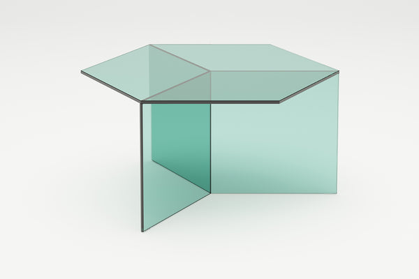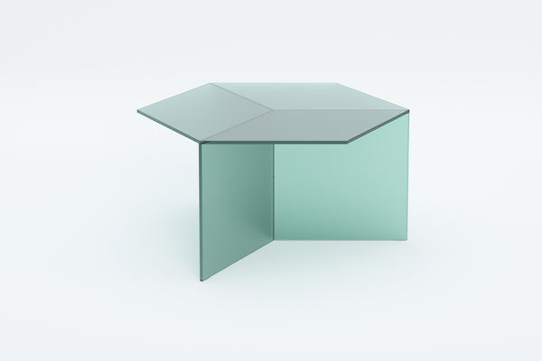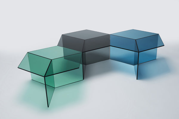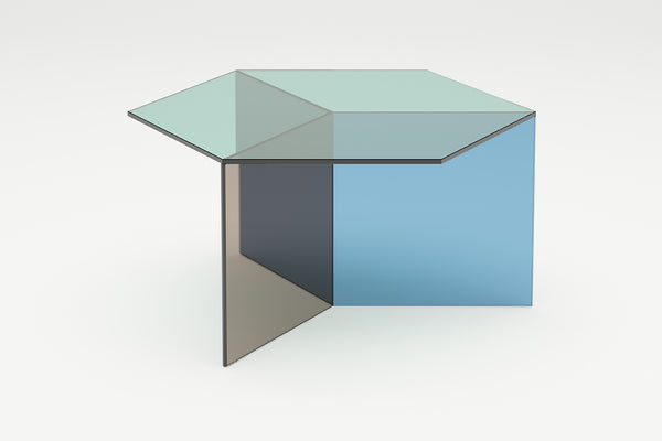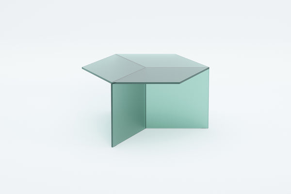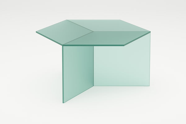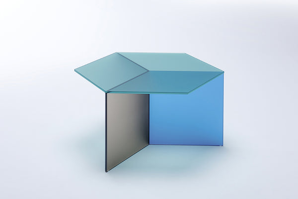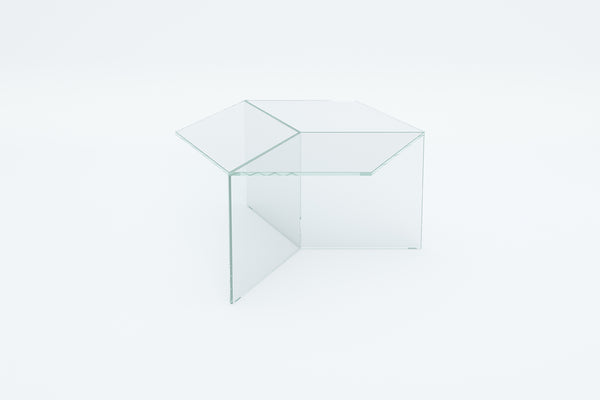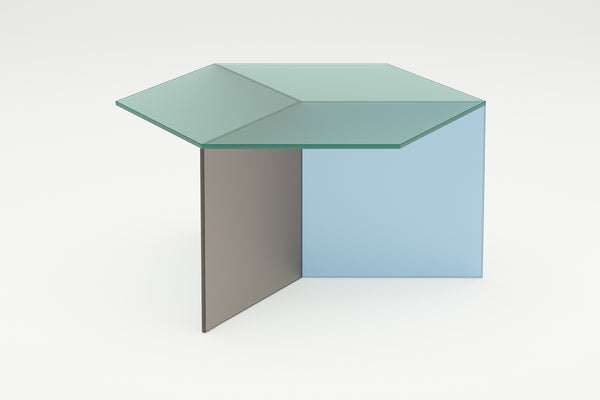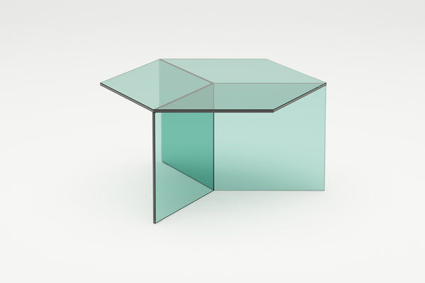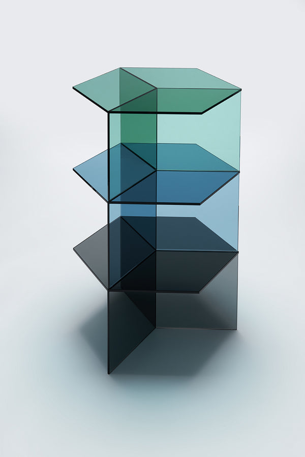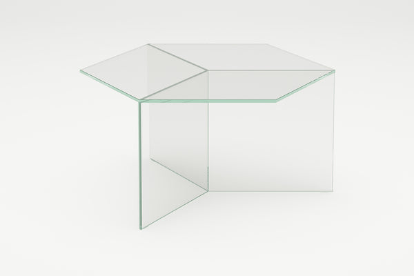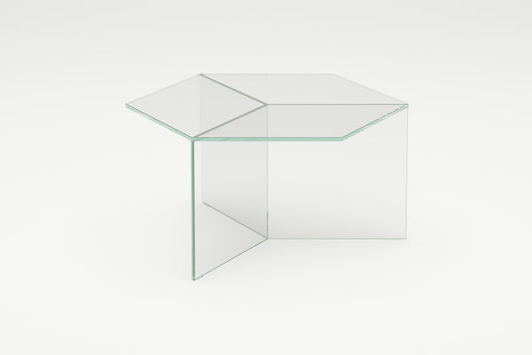 The Isom tables play with a fascinating optical illusion. The hexagonal glass panel is UV glued with three vertical foot elements whose edges, viewed from a certain angle, convey the perfect isometric drawing of a cube. A special detail are the CNC-ground double mitres and the seamless bonding of the foot elements. The different sizes and variants can be combined very well. The glass tables are available in four colours, each in clear glass and satin glass. Design: Sebastian Scherer