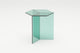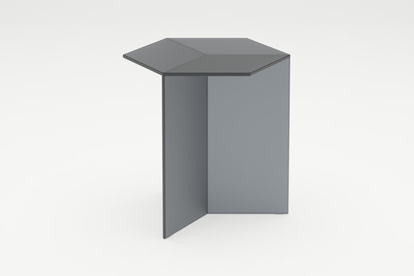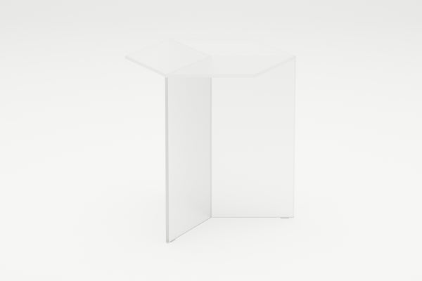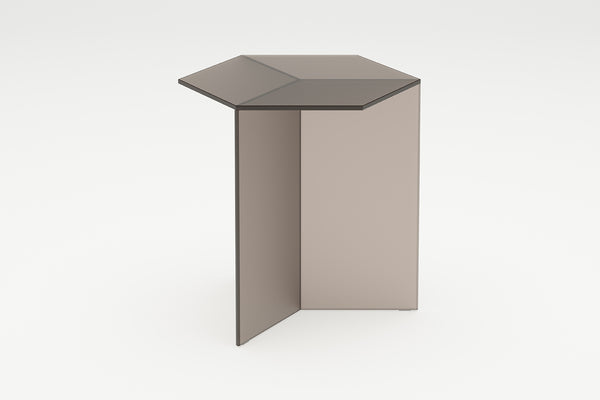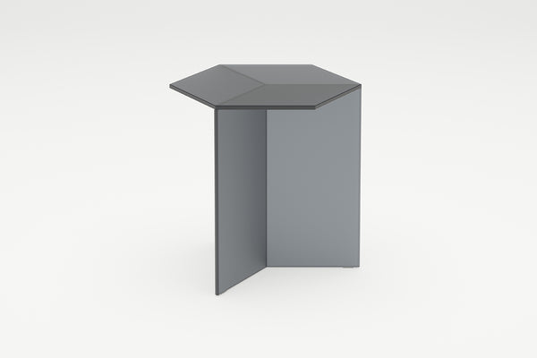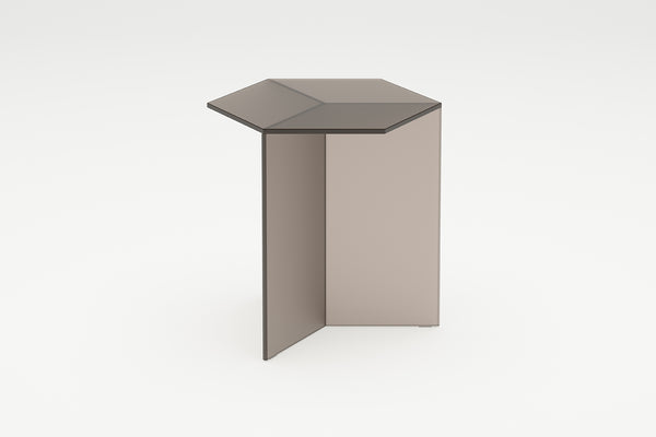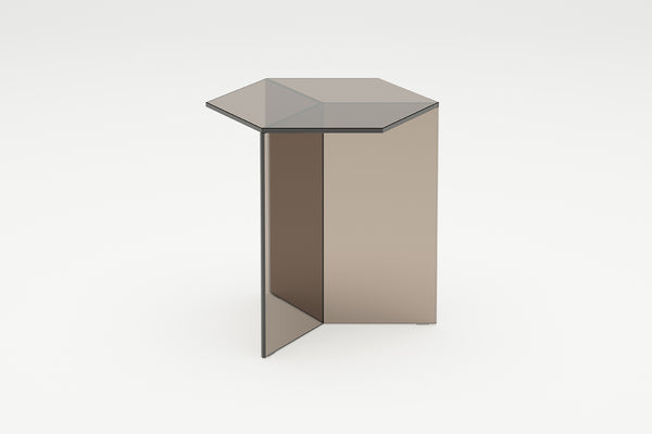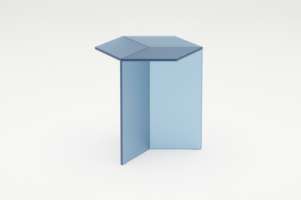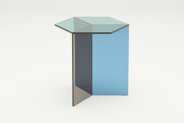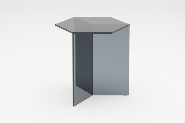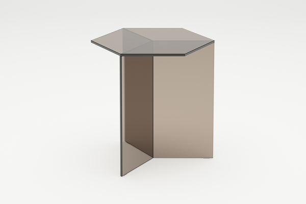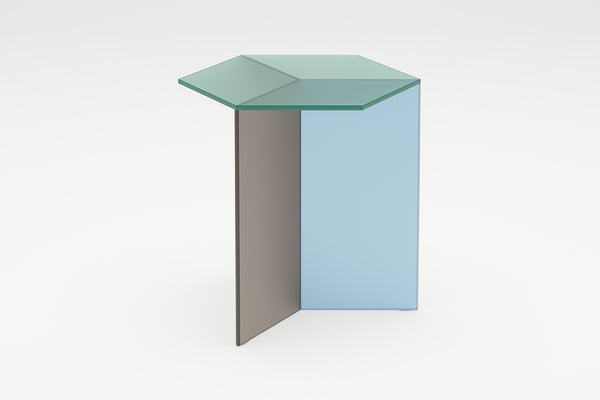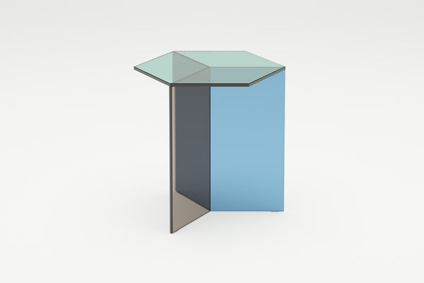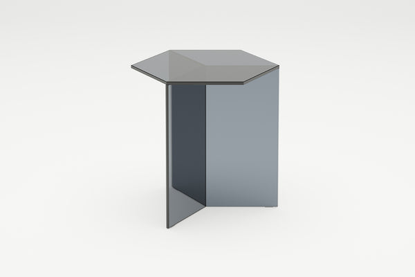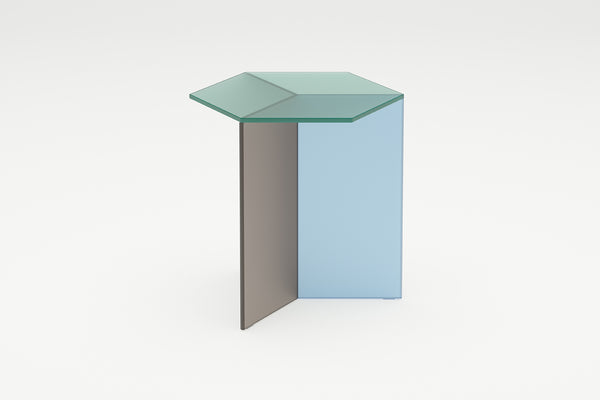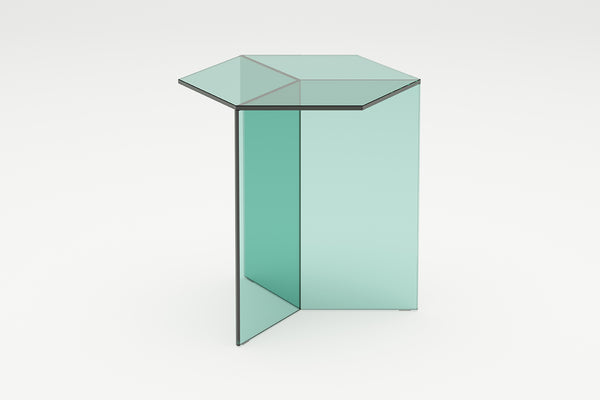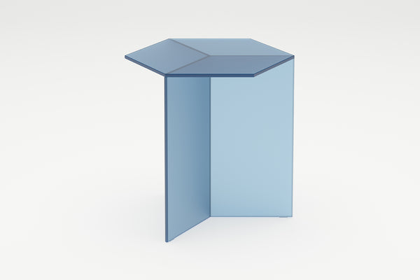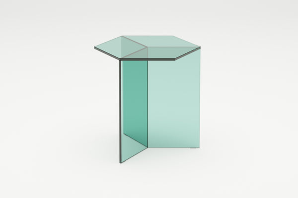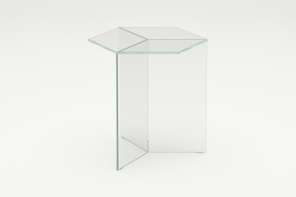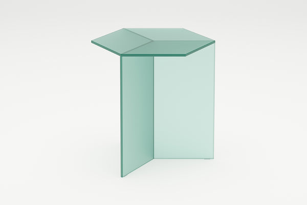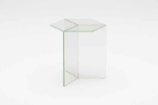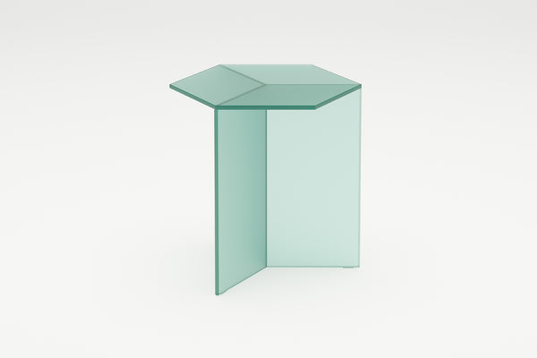 The Isom tables play with a fascinating optical illusion. The hexagonal glass panel is UV glued with three vertical foot elements whose edges, viewed from a certain angle, convey the perfect isometric drawing of a cube. A special detail are the CNC-ground double mitres and the seamless bonding of the foot elements. The different sizes and variants can be combined very well. The glass tables are available in four colours, each in clear glass and satin glass. Design: Sebastian Scherer