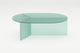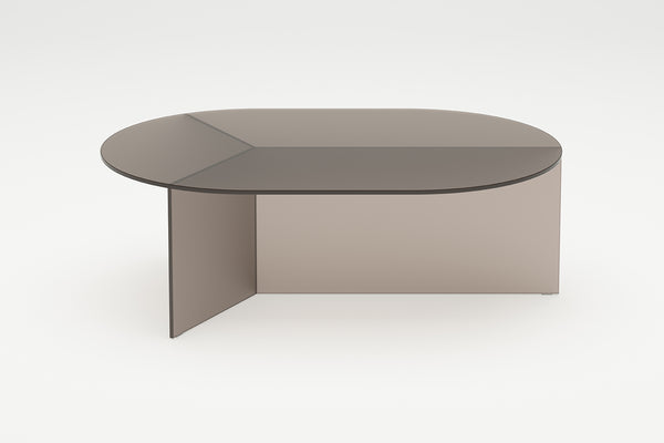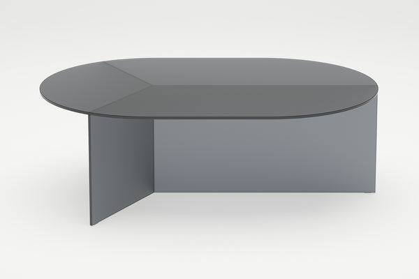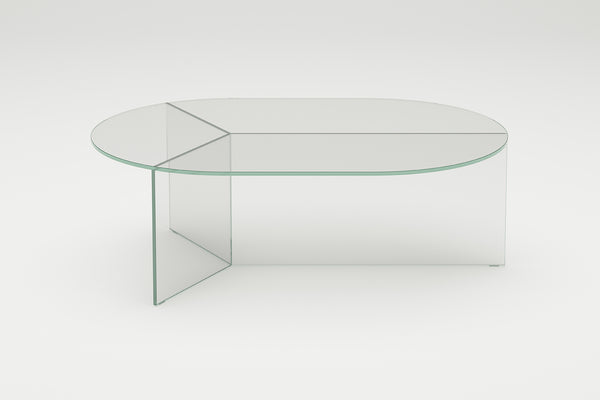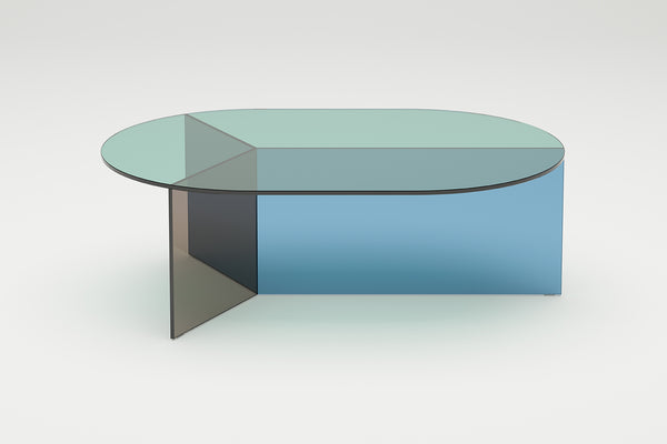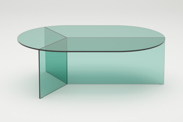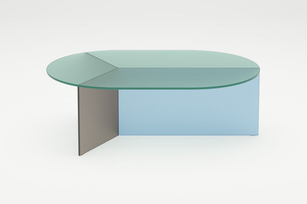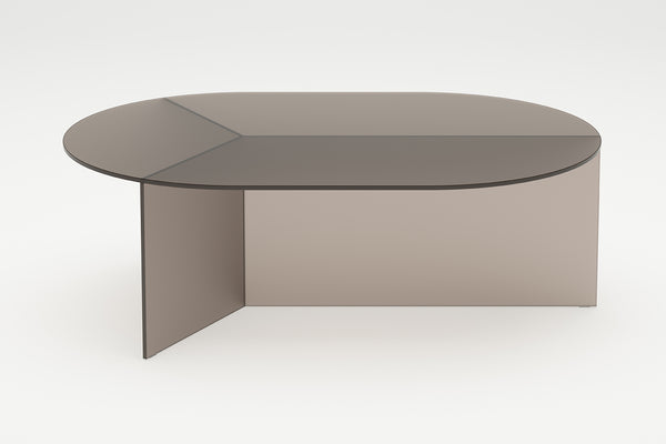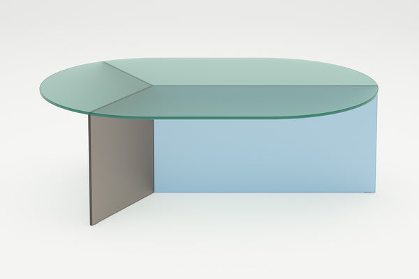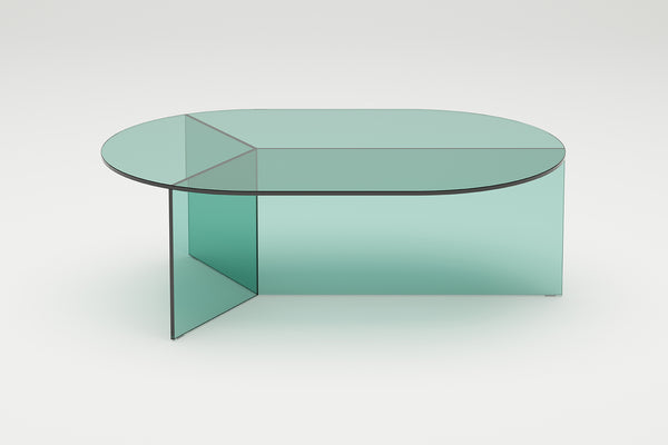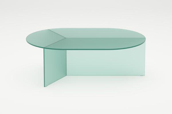 The Osom tables are the round version of the Isom tables and can be ideally combined with each other. As with the hexagonal Isom tables, the base consists of three foot elements arranged at equal angles, which give the table its sculptural appearance. This design idea from 2012 formed the beginning of the glass table series by Sebastian Scherer. A special detail are the CNC-ground double mitres in the middle and the jointless bonding of the foot elements. The glass tables are available in five colours, each in clear glass and satin glass. Design: Sebastian Scherer
