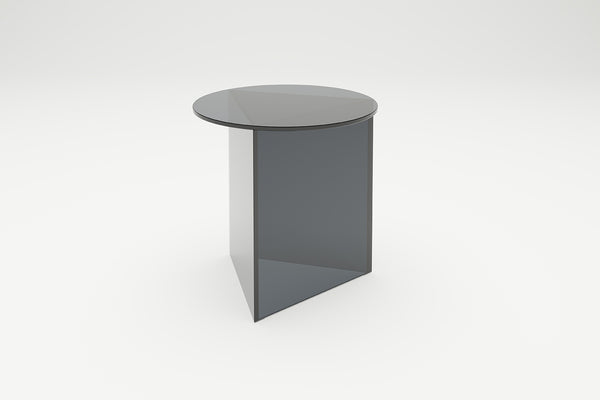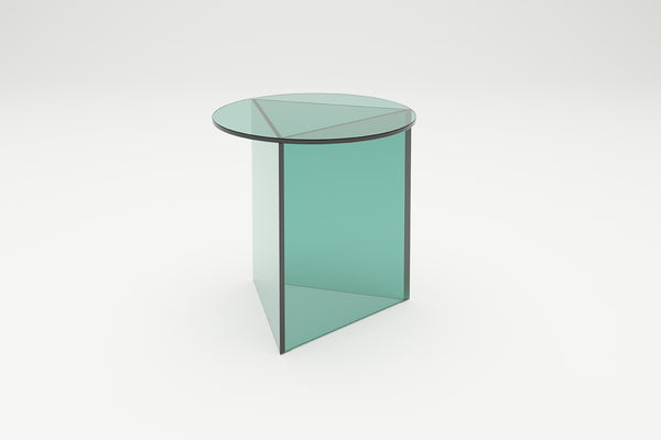 Triangle meets circle. The idea for PRISMA is based on a simple idea : on a triangular base lies a round table top of the same size. A special feature are the tapered edges of the base. This sophisticated detail gives the table its filigree and at the same time monolithic-sculptural appearance. The prism-shaped base also gives the table its name. PRISMA is available in the three versions "Tall", "Circle" and "Oblong", each in the materials glass, travertine and steel. In the glass version, the interplay of the dark edges and overlapping of the coloured glass surfaces creates an abstract geometric sculpture. The thin edge in the metal version creates a very filigree aesthetic, while the monolithic overall impression dominates in marble. Design: Sebastian Scherer